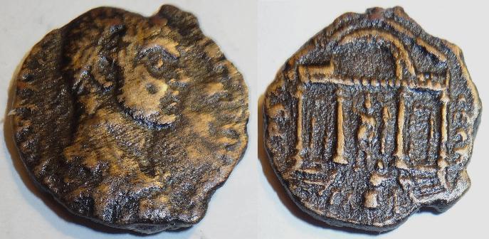 The second right one is from Antiochia (in today's Turkey) struck in 330-5AD. The obverse has a rosette-diademed, draped and cuirassed bust facing right with the title CONSTANTINVS MAX AVG. The reverse has two helmeted soldiers standing facing one another, with spears and shields and standards between, mintmark SMANA in the exergue and the legend GLORIA EXERCITVS. The coin measures 16mm..
