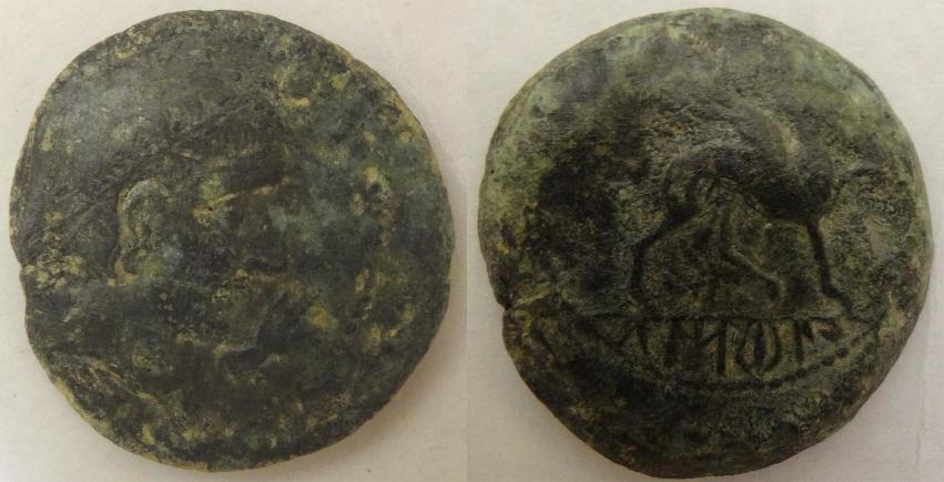 This bronze coin was minted by Augustus around 30BC, The obverse has the bare head of Augustus (Octavian) facing right with the inscription IRIPPO. The reverse has has a female seated left holding pine cone and cornucopiae. The coin measures 25mm. Irippo was located near today's Sevilla, Spain.