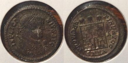 The second left one is from Arles (France) in 322-3AD. The obverse has the laureate head facing right with the title CONSTANTINVS AVG right. The reverse has VOT XX in wreath, mintmark P* AR in exerge encircled by the legend / DN CONSTANTINI MAX AVG. The coin measures 18mm.