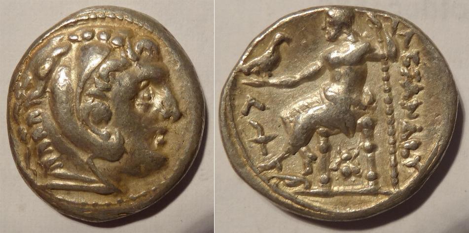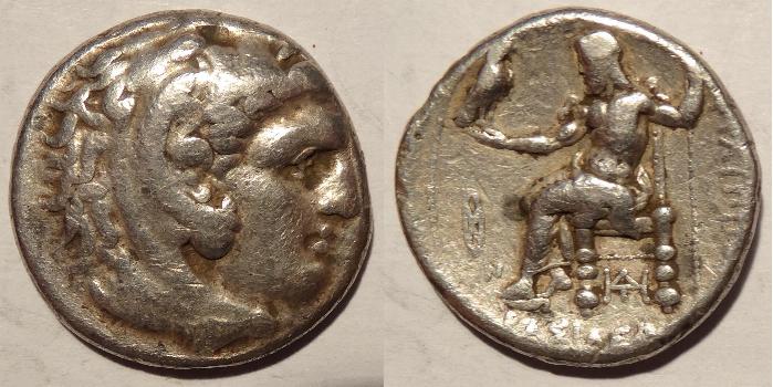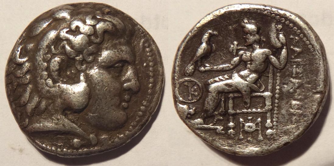 This coin is a tetradrachm issued in the name of Philip III, half brother of Alexander the Great, about 323BC. It was minted from Alexander's death in Babylon to about 316BC. It measures 26mm and weighs 17 grams. The obverse has the head of Herakles wearing a lion scalp and facing right. The reverse has Zeus enthroned left, holding an eagle in right hand; with a monogram under the throne, To the right is ΦΙΛΛΙΠΟΥ, ΒΑΣΙΛΕΩΣ is in the exergue. There are two monograms to the left of Philip's knees, one being an ear of corn and the other a character similar to N.