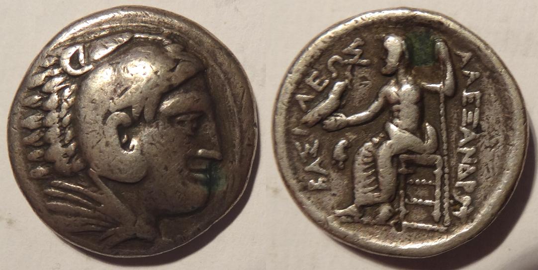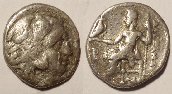 This coin is a drachma issued in the name of Philip III, half brother of Alexander the Great, about 323BC. It was minted from Alexander's death in Babylon to about 316BC. It measures 17mm and weighs 4 grams. The obverse has the head of Herakles wearing a lion scalp and facing right. The reverse has Zeus enthroned left, holding an eagle in right hand and a staff in his left. To the right is ΦΙΛΛΙΠΟΥ. There is a monogram of a griffen to the left of Philip's knees.