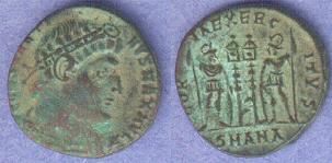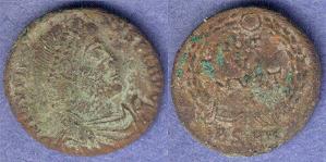 This bronze coin was minted by Theodosius in 393-395AD. The obverse bas a laureated head facingg right with the title DN THEODOSIUS P F AVG. The reverse has Theodosius standing to the right. holding the labarum and globe with the mintmark SMKA in the exergue and the legend GLORIA ROMANORVM. The coin measures 22mm.