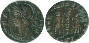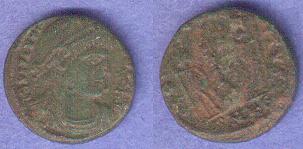 The third right one is from Cyzicus (in today's Turkey). The obverse has a diademed cuirassed bust facing right with the title CONSTANTINVS MAX AVG. The reverse has two soldiers standing front, heads turned inward at two standards between them, each holding spear and shield, mintmark SMKS in the exergue with the legend GLORIA EXERCITVS. The coin measures 15mm.