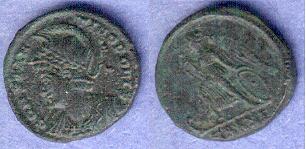 The bottom left one's obverse has a helmeted bust of Roma facing left with the legend VRBS ROMA. The reverse has two helmeted soldiers facing each holding inverted spear and rests on a shield with the mintmark CONSA and the legend GLORIA EXERCTVS. It was minted in Constantinoplis about 340AD and measures 14mm.