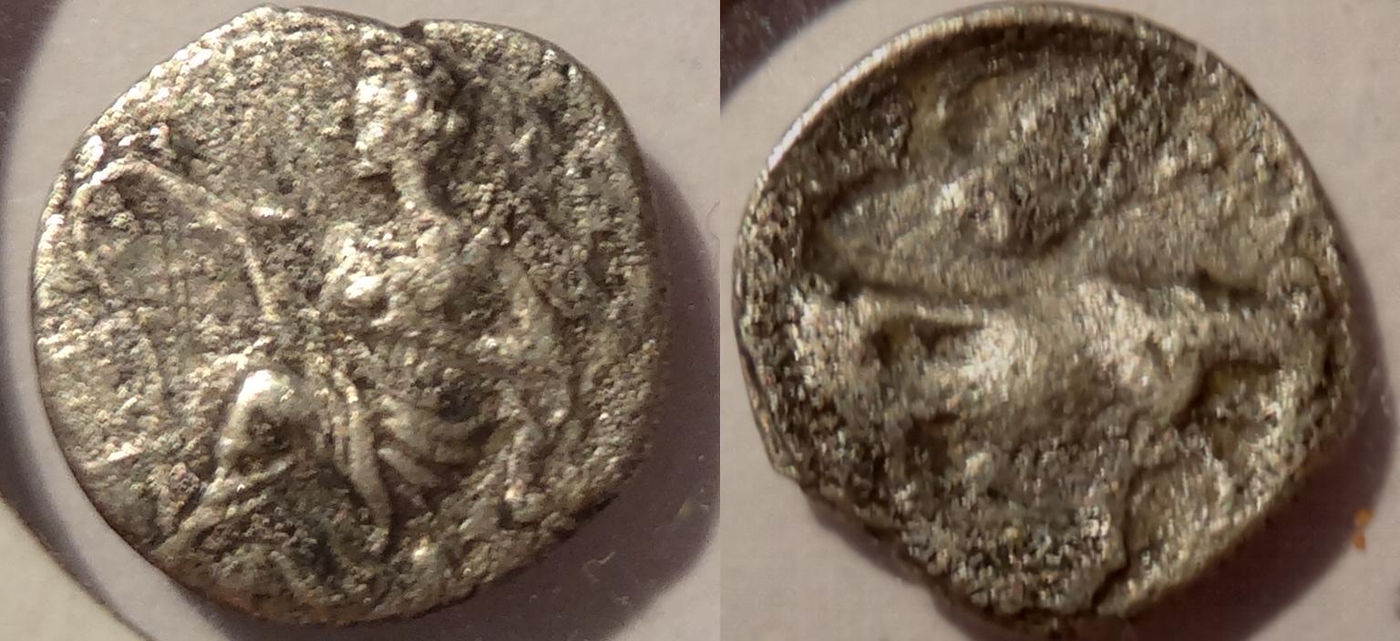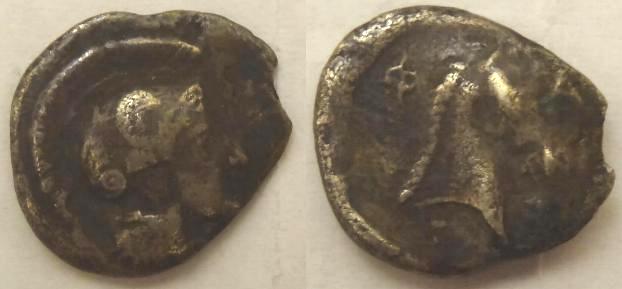 This is silver hemidrachma (half drachm) issued in 440-344BC. The coin measures 14mm. The obverse has a bust of Athena in crested Attic helmet facing right. The reverse has a horse head facing right with ΦΑΡΣ around the head.