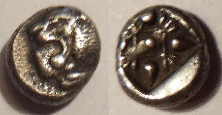 This tiny silver coin is a hemiobol (1/12 drachm) isued in Miletos around 525BC. It is of the earliest coin design, a figure of a roaring lion''s head on the obverse and a geometric star shaped punch on the reverse. The coin measures 8mm.