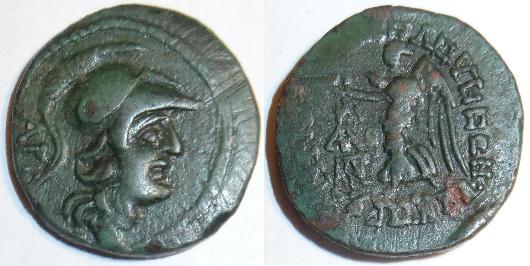 This coin is one of the last of the types ("new style"). This type was minted around 125BC. The obverse has Athena Parthenos in a triple crested helmet. The reverse has the Athenian Owl standing on an amorpha with a tripod to the left and ΣΦ in the exeurge. The legend ΑΘΕ ΠΟΛΕ-ΜΩΝ ΛAΚΕ- ΤΗΣ -ΡΑΤΡ. These coins were issued by various magistrates and this identifier indicates that POLEMON LAKE OF PATRON was the patron