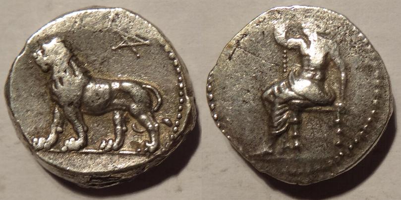 This coin is a silver tetradrachm issued about 411BC . It measues only 23mm in diameter but is about 4mm thick. It weighs about 17 grams. The obverse pictures a lion with a 5 pointed star above. The reverse has the image of the god Baal sitting facing left.