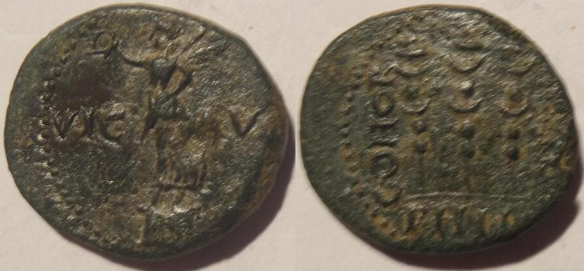 This is a bronze coin minted for Augustus around 27BC-14AD. The obverse has Nike standing left on globe holding wreath and palm with the legend VIC AVG. The reverse has three military standards with the legend COHOR PRAE PHIL.The coin measures 19mm.