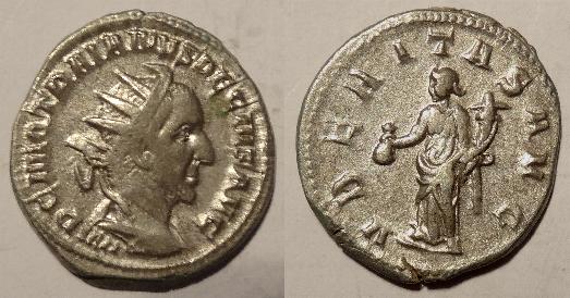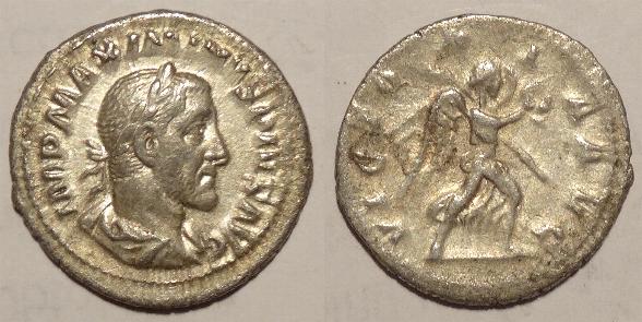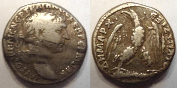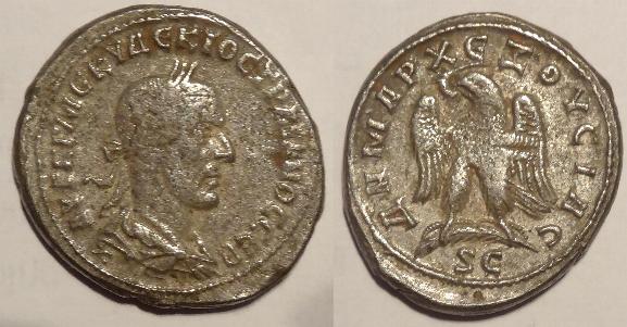 This is a base silver coin minted by Trajan Decius around 250AD. The obverse has his laureate head facing right with his title AVT K G ME KY DEKIOC TPAIANOC CEB. The reverse has an eagle standimg facing right on a [palm branch with wreath in beak with the legend DHMAPX EXOYCIAC with SC in the exergue. The coin measures 27mm.