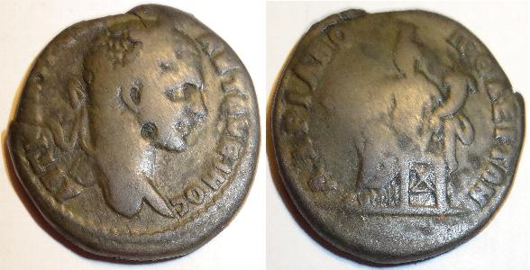 This is a bronze coin minted for Septimus Servus in 193-211AD. The obverse has a laureate, draped and cuirassed bust of Septimus Servus right with the title AV Λ CEΠT CEVHPOC. The reverse has Cybele seated left with patera, arm on drum, lion at side with the Greek legend for the magistrate Julius Faustinianus and the city's name VI FAVCTINIANOV MARKIANOPOLITWN .The coin measures 27mm.
