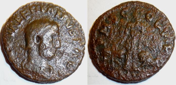 This bronze coin was minted by Valentinan I. The obverse has a laureate bust facing right with the title D N VALENTINIAVS PF AVG. The reverse has the emperor in military dress, advancing right, head left, holding labarum, dragging a captive behind him. There is in the left field an S over dot and in the right field a C over symbol 4 with the mintmark BSISCZ in the exergue. The coin measures 22mm.