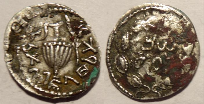 This is a silver denarius from Judaea issued during the Bar Kochba War, 134/135 AD. .The obverse has an inscription in paleo-Hebrew for Simon within wreath. The reverse has a jug with handle, palm frond to right with the paleo-Hebrew inscription around "for the freedom of Jerusalem". Traces of Latin inscriptions of the original Roman denarius that was overstruck are visible at the 10 o'clock position on the obverse. .The coin measures 19mm.