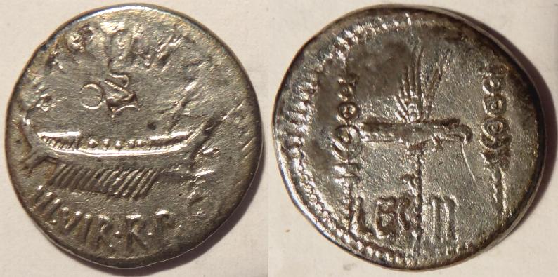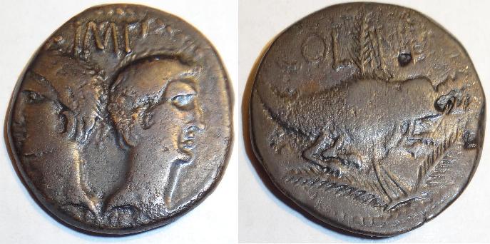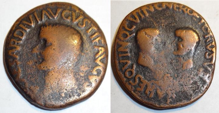 Another version of this bronze coin was minted in 27BC-14AD in Nemausus (present day Nimes France). The obverse features the heads of Agrippa to left and Augustus to right, back to back, that of Agrippa wearing combined rostral crown and laurel wreath, that of Augustus bare-headed with IMP above and DIVI below (off the planchet). The reverse has a palm-shoot behind a chained crocodile; to left and right of palm-shoot, wreath with long ties with COL NEM. The coin measures 26mm.