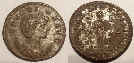 This is a silvered billon antoninianus issued for Severina around 274AD. The obverse has her bust facing right with corn cobs bottom left and right of portrait with her title SEVERINA AVG. The reverse has Concord standing between two military standards with Greek letter Δ to the right and XXIR in exergue with the legend CONCORDIAE MILITVM. The coin measures 21mm.