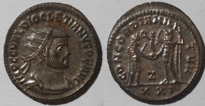 This is a silvered billon antoninianus issued by Diocletian minted in Antioch in today's Syria. The obverse has his radiate draped bust right with his title IMP C C VAL DIOCLETIANVS P F AVG. The reverse has Diocletian receiving Victory on globe from Jupiter with Z in the lower center, XXI in the exergue, with the legend CONCORDIA MIL-ITVM. The coin measures 22mm.