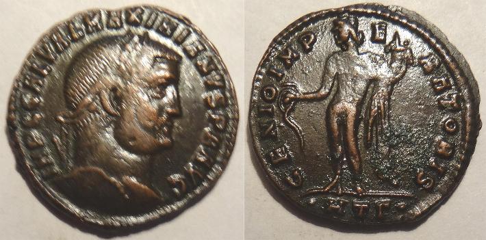 This is bronze follis struck under Galerius in 308-9AD. It was minted in Heraclea in today's Turkey. The obverse has a laureate facing head right with the title IMP C GAL VAL MAXIMIANVS P F AVG. The reverse has Genius standing left pouring liquid from a patera and holding cornucopia with the mintmark dot HTG dot in the exergue and the legend GENIO IMPERATORIS. The coin measures 25mm.