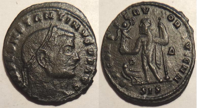 The top left one is from Siscia (in today's Croatia) - The obverse has a laureate head facing right with the title IMP CONSTANTINVS P F AVG. The reverse has Jupiter standing facing with head left, chlamys hanging from left shoulder, holding Victory on globe and leaning on scepter, eagle left, officina letter E to right, with the mintmark SIS in the exergue and the legend IOVI CONSERVATORI AVGG NN. The coin measures 22mm.