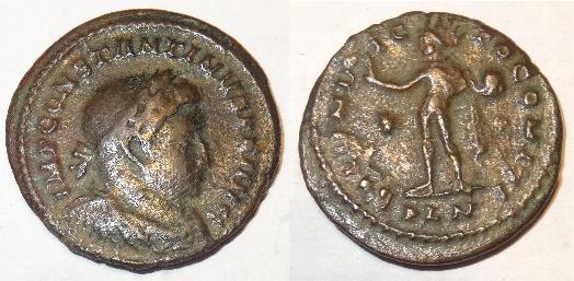 The top right one is from London minted in 310AD. The obverse has a laureate and cuirassed bust facing right with his title IMP CONSTANTINVS P F AVG. The reverse has Sol standing left, chlamys falling from left shoulder, holding globe, right hand raised, mintmark PLN in exerge and the legend SOLI INVICTO COMITI. The coin measures 22mm.