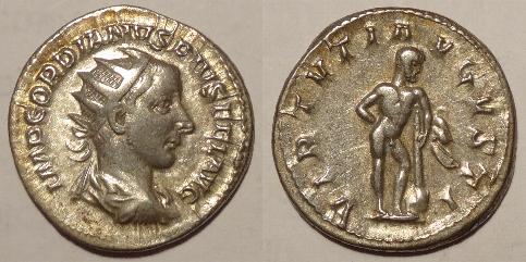 This is a bronze coin minted for Gordian III in 243AD. The obverse has a laureated and cuiriassed. bust of Gordian III facing right with his title IMP GORDIANVS PIVS FEL AVG. The reverse has Moesia standing facing, head left, between bull and lion with the legend P M S COL VIM, and AN V in exergue. The coin measures 27mm.