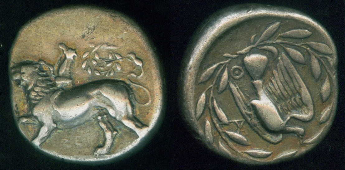 Many of the cities issued coins that bore the image of their patron god or goddess or a legendary hero (such as Hercules) on the obverse and a symbol of the city on the reverse. An example is Rhodes that used a rose as the Greek word for rose is ρόδον. Gradually, some of the cities started using their name or abbreviations of same on the reverse side.