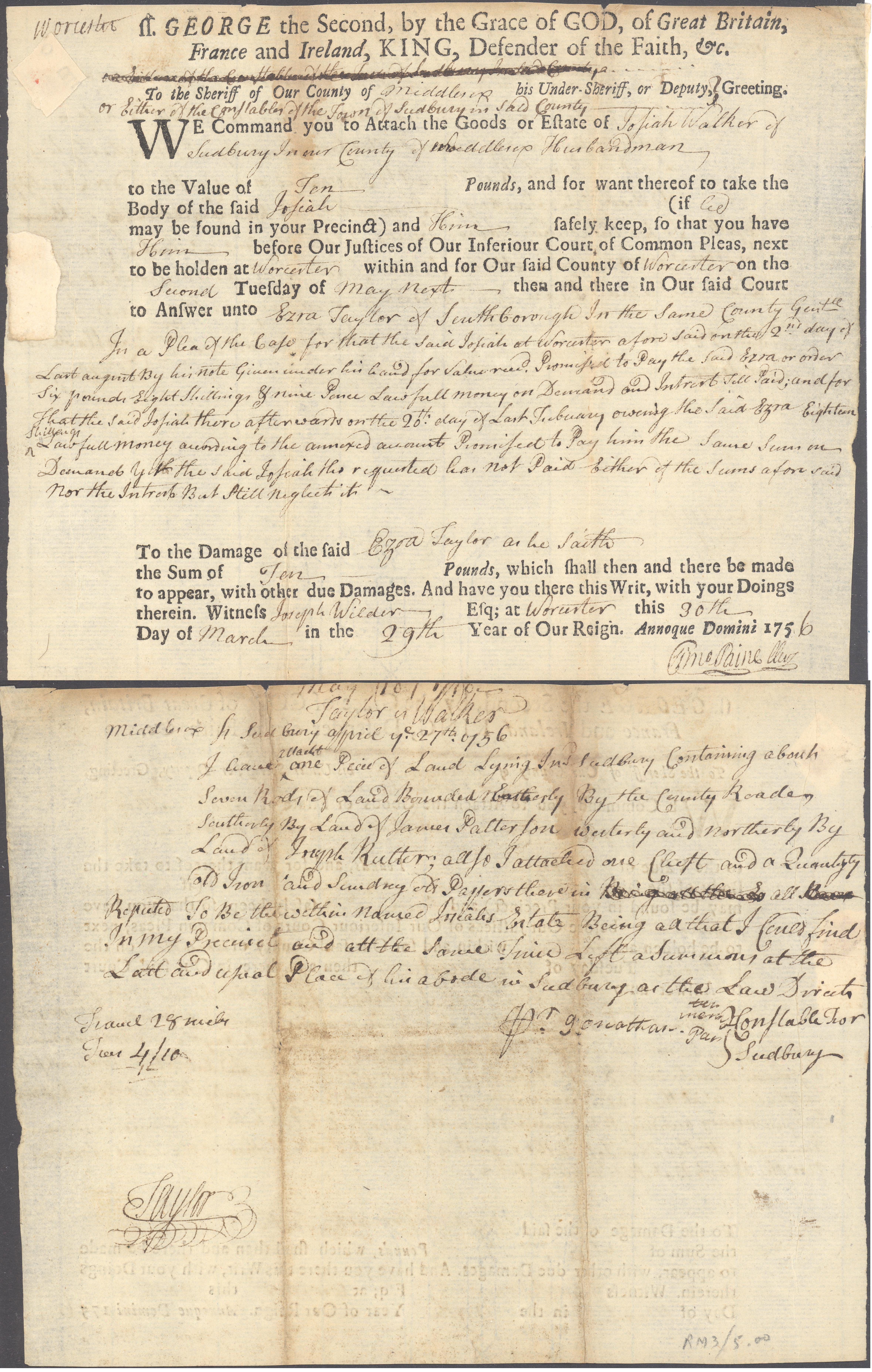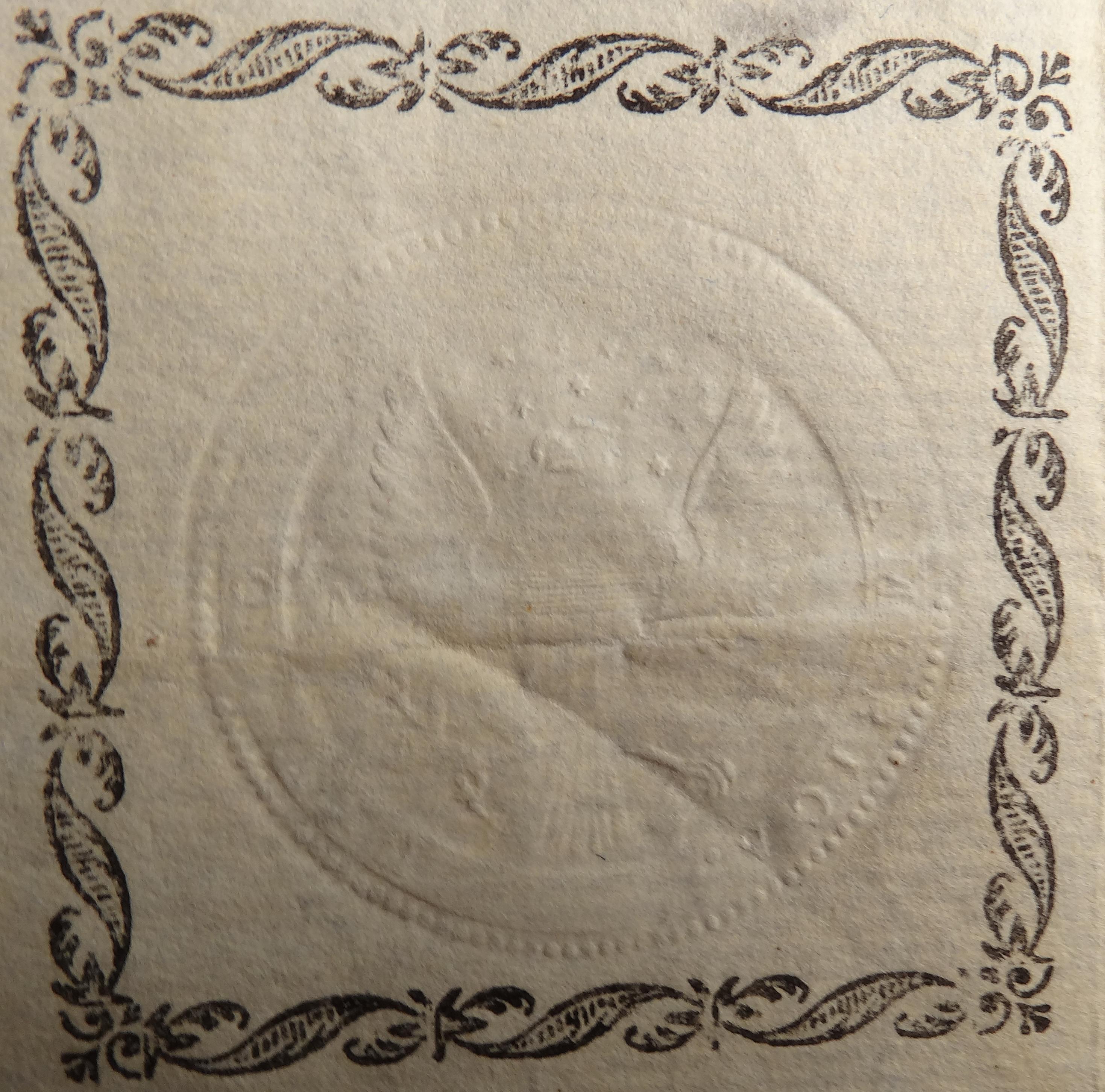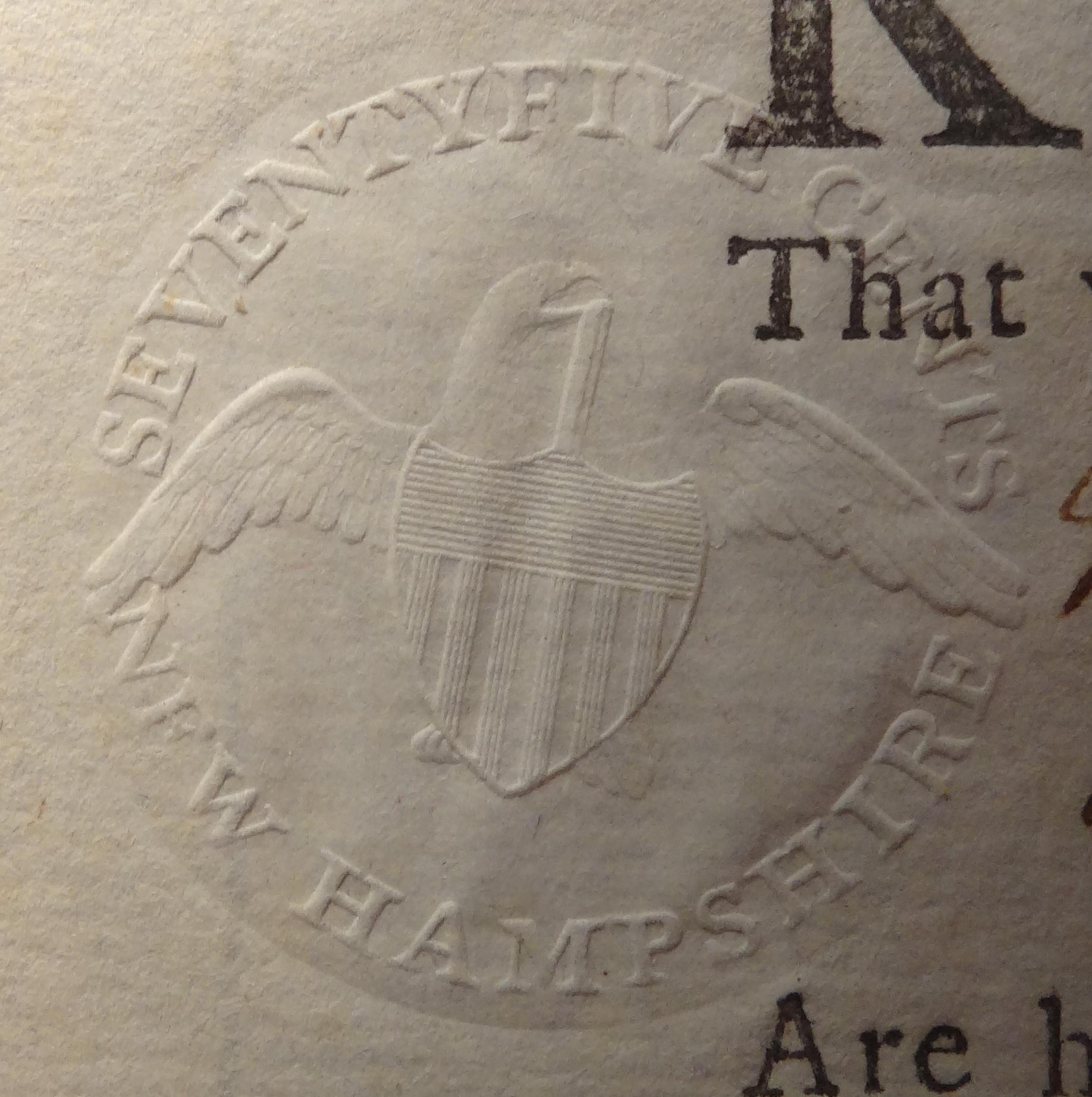 Embossed revenue stamp This stamp is located in the lower left corner of the document. The stamp, Scott no. RM3, features a Pine Tree with the denomination III PENCE in the center. The outside ring reads PROVINCE OF THE MASSACHUSETTS.